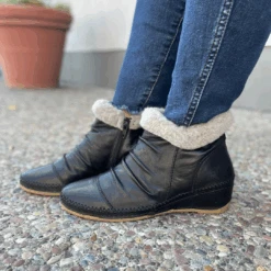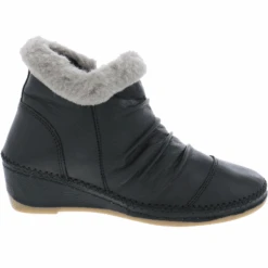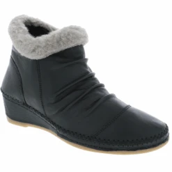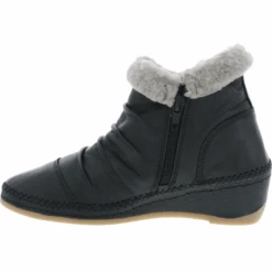 Stylish nods to winter make the Capri by Anesha the perfect fall women’s bootie for any occasion. With a fashionable faux fur collar and pleated leather design details, this side zip hand stitched wedge bootie is sure to turn heads. The leather lined cushioned insole absorbs shock, while the flexible rubber outsole keeps you moving in sophisticated comfort.