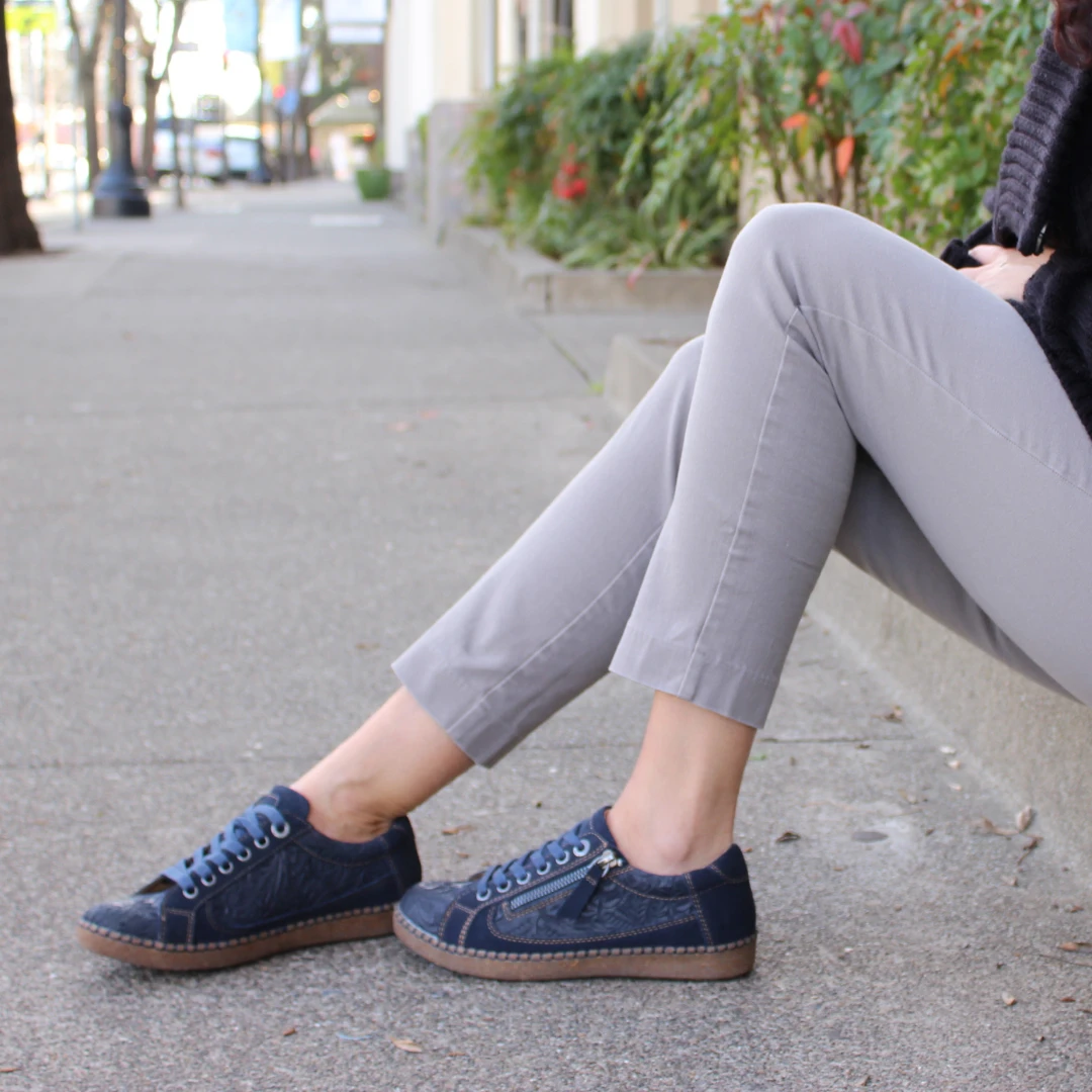 Featuring hand burnished leathers and a unique floral embossed print throughout, the Aztec 2 by Biza Shoes is everything you want in a stylish women’s sneaker. The fully functional zipper makes getting these on a breeze while the laces ensure you get a perfect fit every time. The microfiber lined memory foam insole absorbs shock effortlessly and can easily accommodate custom orthotics. The cork injected rubber outsole offers flexibility, support and durability and you’re going to love the whipped stich detailing of the outsole construction.