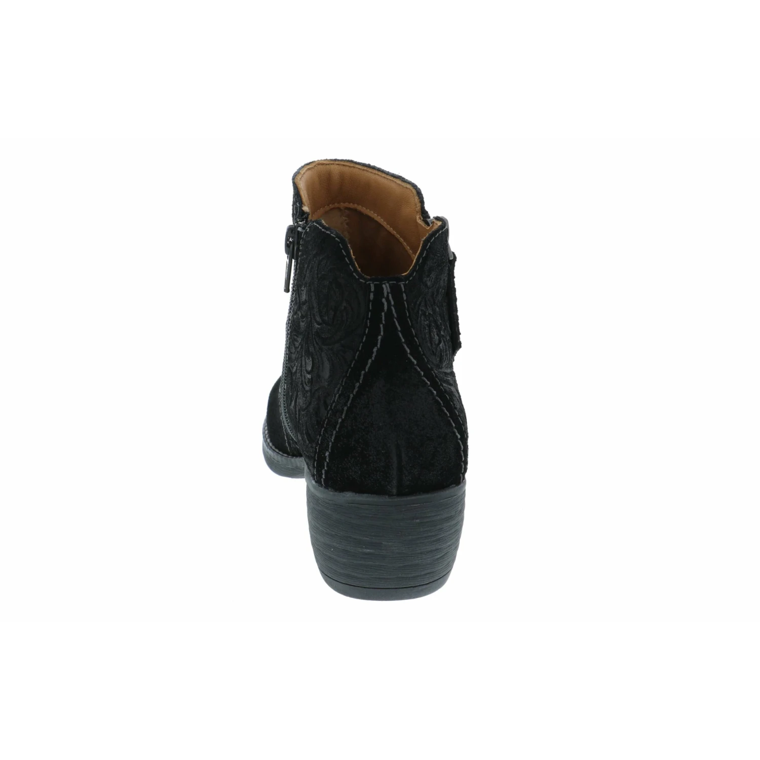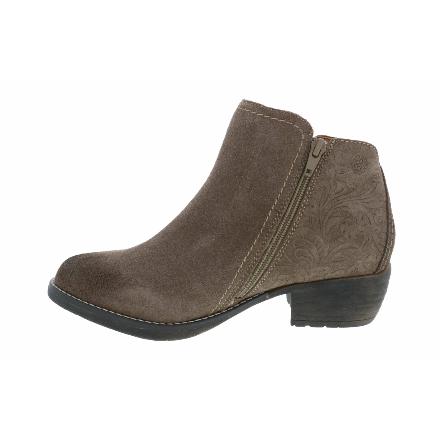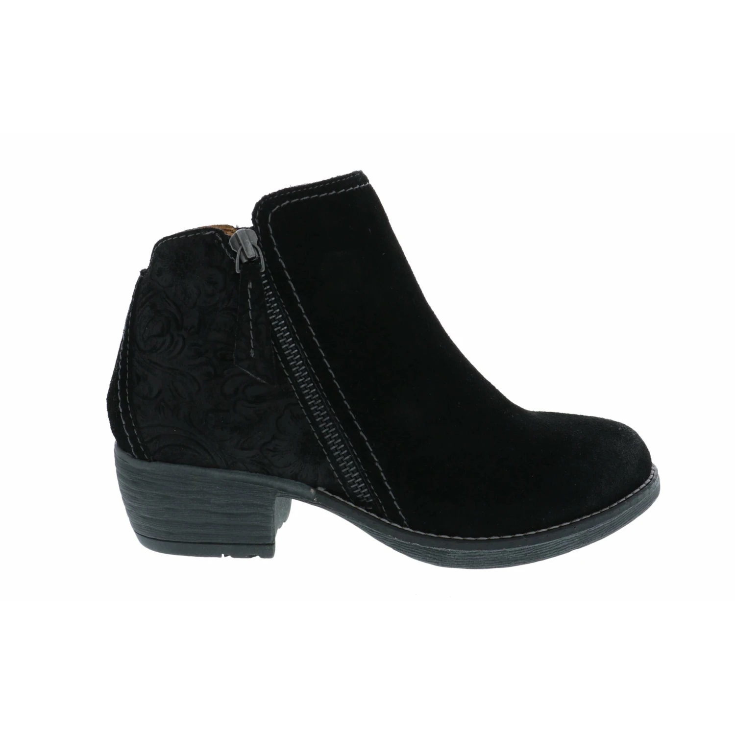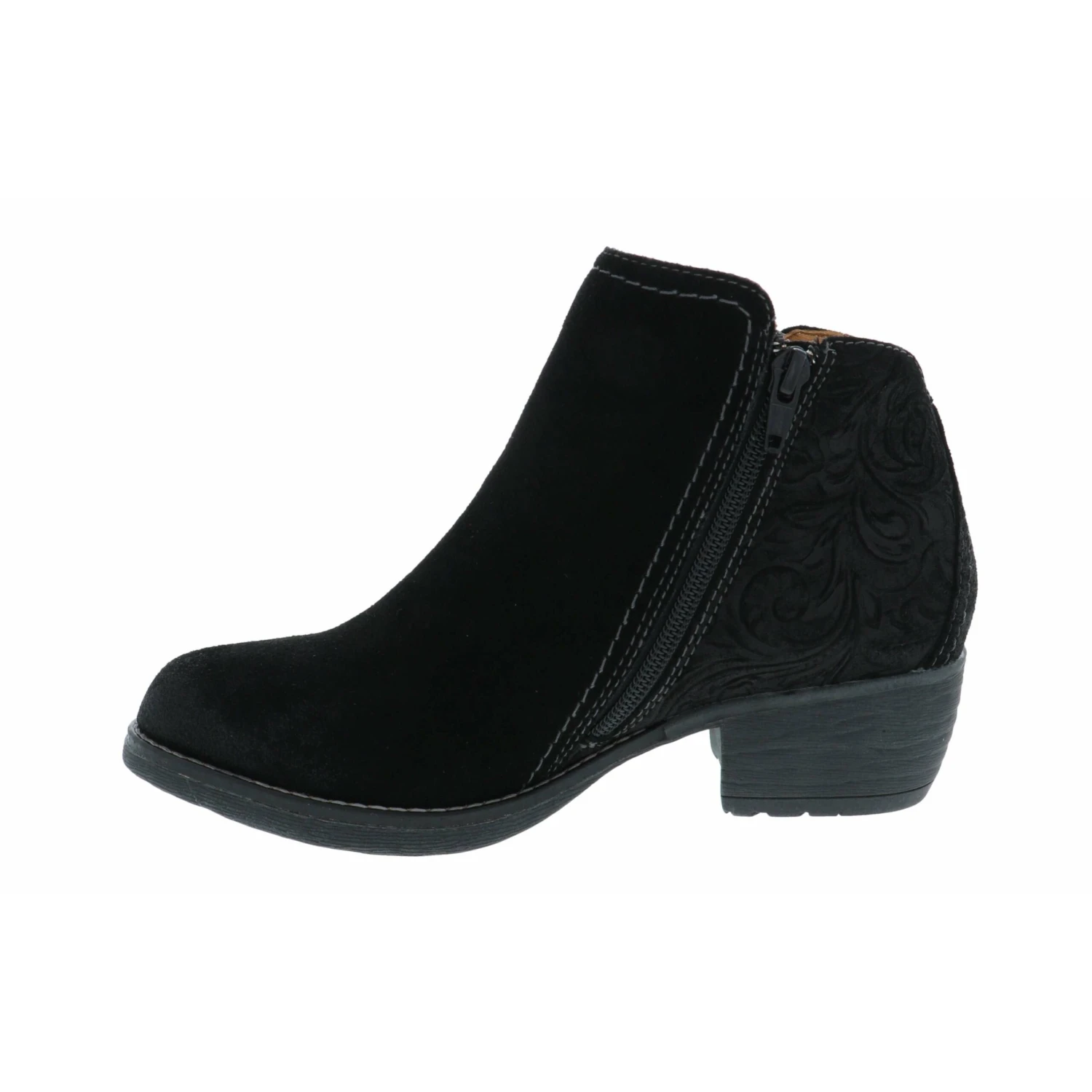 This season’s must have women’s bootie by Biza® Shoes offers style and comfort all wrapped up in suede perfection. The Cypress boot features unique printed floral leather side panels with an easy interior zipper for effortless wear. The exterior faux zipper adds a little flair to this basic bootie. This boot features a fully removable leather lined memory foam insole which can easily accommodate custom orthotics. Soft plush velour lining surrounds the foot in total comfort creating the perfect fit to this perfect fall boot.