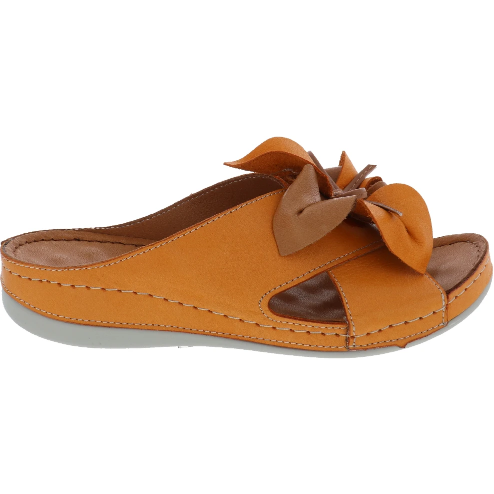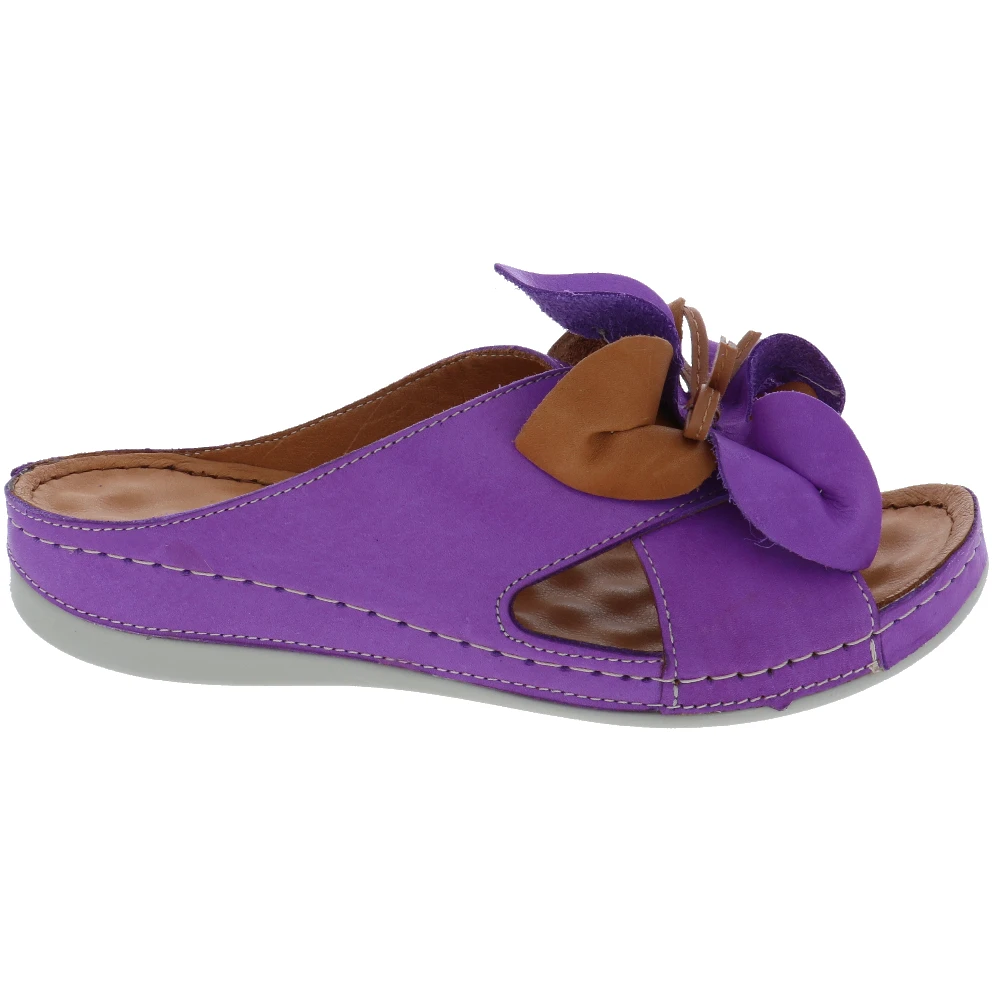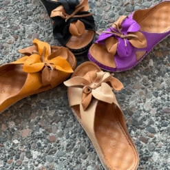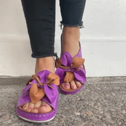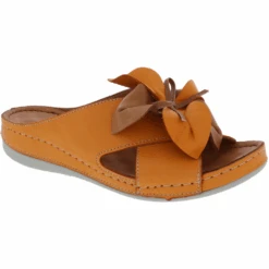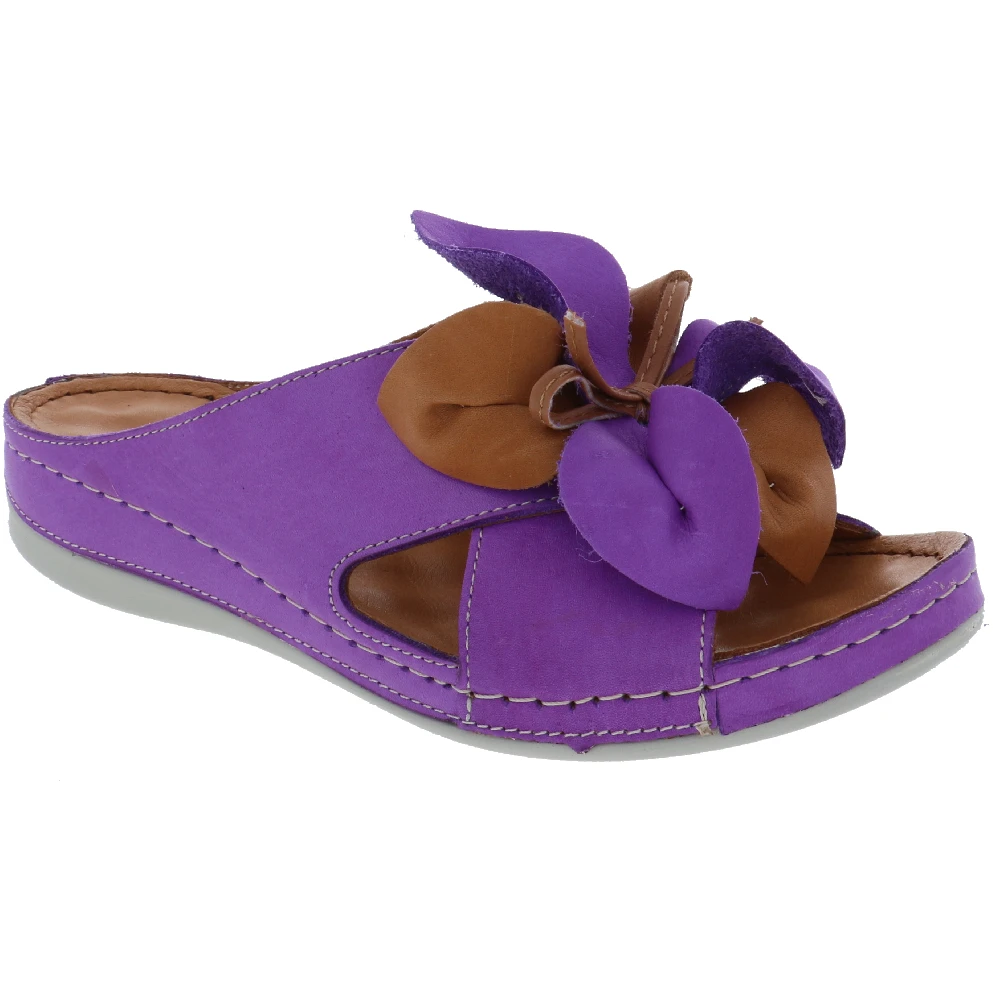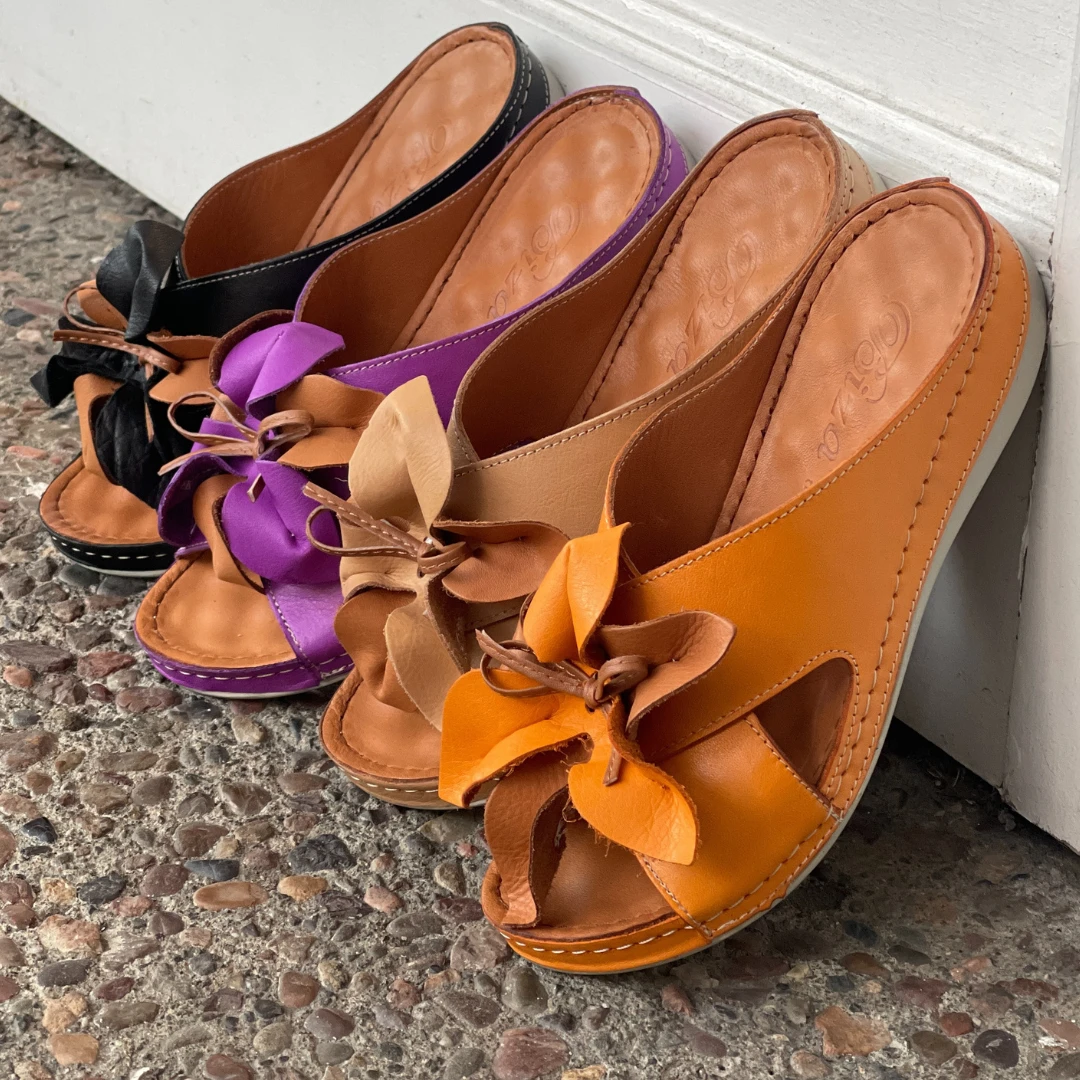 Live life in full bloom with the Nylah women’s sandal by Biza Shoes. This cheerful lightweight woman’s slip-on sandal features a two-toned floral leather embellishment stitched into a crisscross all leather design. The leather lined interior offers a cushioned pillow-like insole that absorbs shock with every step.