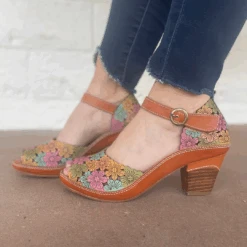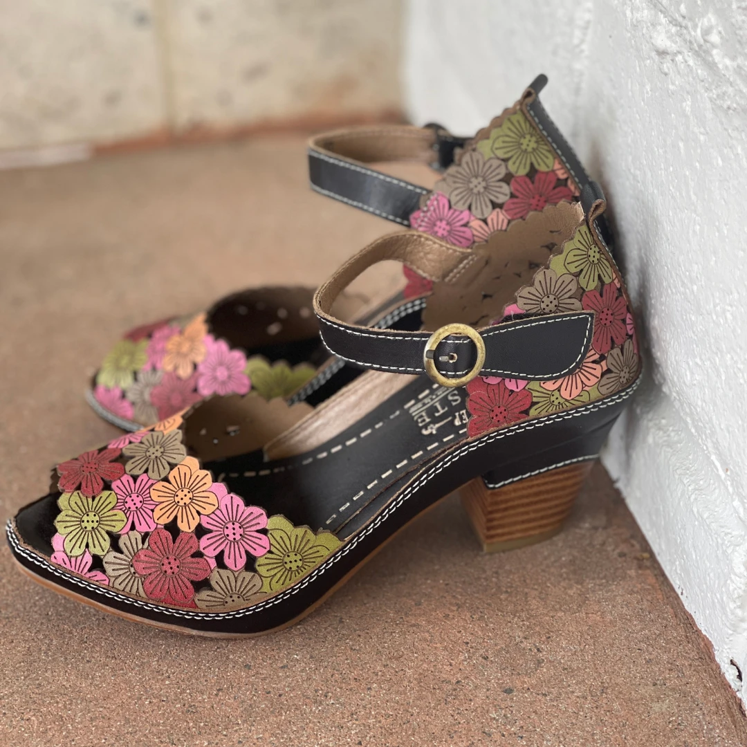 L’ARTISTE AVNIA Peep Toe Sandal by Spring Step features charming hand-painted leather French-inspired design with multi-color delicate floral laser etching and cutouts on the toe and heel for a dainty whimsical feeling.